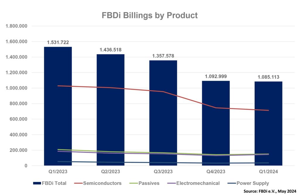 Der Umsatz der Elektronik-Bauelementedistribution (gemäß FBDi e.V.) geht im ersten Quartal 2024 um 29 % zurück.