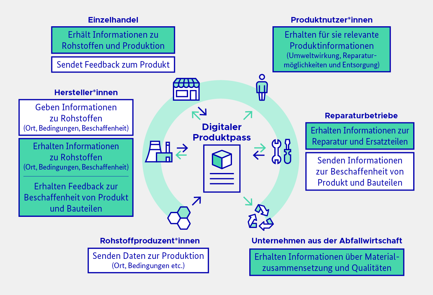Bei Produkten des täglichen Lebens besteht Informationsbedarf, darum sollen langfristig alle Produkte einen DPP bekommen. Dieser soll vom Rohstoff bis zum Recycling für Transparenz entlang des gesamten Lebenszyklus eines Produkts sorgen und als Entscheidungshilfe für den Erwerb von nachhaltigen Produkten dienen. Laut BMUV (Bundesministerium f. Umwelt und Verbraucherschutz) sollen alle Informationen zum Produkt im ‚Single Point of Truth‘ zusammenlaufen, wo diese gezielt für die jeweiligen Nutzergruppen wie Hersteller, Reparaturbetriebe, Recyclingunternehmen, bereitgestellt werden, z.B. als zentrale Datenbank mit Zugriff über eine App. So unterstützt der DPP eine umweltgerechte Kreislaufwirtschaft – von der nachhaltigen Rohstoffgewinnung, über die nachhaltigere Herstellung und Nutzung bis zum fachgerechten Recycling zum besseren Schutz der Umwelt.