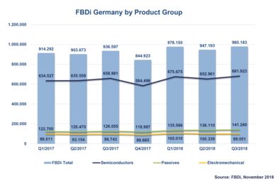 The German component distribution market reported solid but sluggish growth for the third quarter of 2018. According to the distribution companies registered with the Fachverband Bauelemente Distribution (FBDi e.V.), sales during the period July to September 2018 grew by 4.7% to reach 980 million euros. The pattern of orders continued the trend of previous quarters, with orders growing significantly faster than sales – by 9.5% to 1.08 billion euros. The book-to-bill rate (the ratio of incoming orders to sales) rose to 1.1.