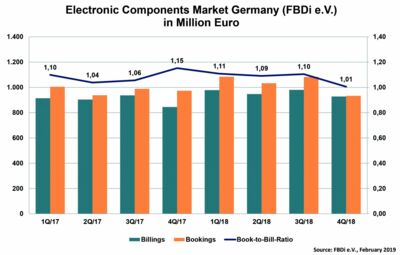 Unusually high sales growth of almost 10% in the last quarter of 2018 brought a conciliatory ending of the year for the German electronic component distribution market. Sales by distribution companies under the umbrella of the Fachverband Bauelemente-Distribution (FBDi e.V.) grew 9.8% to 928 million euros. Conversely, orders fell 4.2% to 933 million euros, equating to a balanced book-to-bill ratio of 1.01.