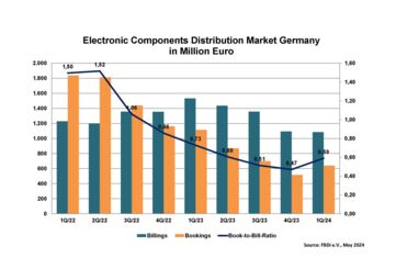 As expected, the drop in orders in the German component distribution market that has been showing since last year, is now being reflected in declining sales. After -20% in the fourth quarter of 2024, turnover in the first quarter of 2024 fell by 29% to EUR 1.09 billion, compared to the record quarter of Q1/2023. New orders were down by -43% to EUR 640 million, but managed a slight sequential turnaround (compared to Q4/23), which led to a slight improvement in the book-to-bill ratio to 0.59.