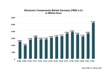 The fourth quarter of 2022 ended for German components distribution sector almost at the same sales level as the record quarter Q3. Sales of distributors reporting through the FBDi rose by almost 38% to €1.36 billion. By contrast, bookings shrank by ~ minus 20% to €1.16 billion. The book-to-bill ratio (ratio of incoming orders to sales) dropped to 0.86.