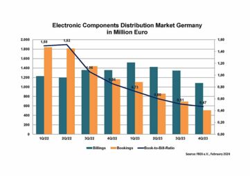 In the fourth quarter, the weak order intake of the last few quarters clearly hit sales. The turnover of FBDi's registered distributors fell by 20.1% to 1.08 billion Euros. As a result of the continued very weak bookings situation (-56% to 507 million Euros), the book-to-bill ratio ended at 0.47, indicating a difficult market situation for the coming quarters. Nevertheless, the full year 2023 remained positive despite the weak second half. Total revenues closed with an increase of 4.4% to 5.37 billion Euros.