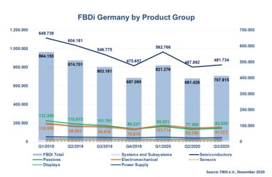 The slight hopes for a summer recovery of the component distribution market after the first COVID 19 wave subsided have not quite materialized. Sales of the distribution companies organized in the Fachverband Bauelemente-Distribution (FBDi e.V.) fell by 11.9% to EUR 708 million in the third quarter. Orders continued to decline, by 8.1% to 626 million Euro. The book-to-bill rate of 0.88 indicates a further weakening of sales until the end of the year. In a 9-month comparison, the distribution market is down 16%.