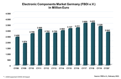 While other regions of the world achieved - in some cases significant - growth in 2020 despite COVID-19, Europe and particularly the German electronic components market were slow. Sales of the distribution companies organized in the Fachverband Bauelemente-Distribution (FBDi e.V.) fell by 14.6% to €2.85 billion, dropping well below the former peak of €3.6 billion in 2018. At the end of the year, the situation became somewhat friendlier, with the fourth quarter ending with a minus of 8.1% and €632 million. By contrast, order intake grew at an above-average rate of just under 23% to €769 million, corresponding to a book-to-bill ratio of 1.22.