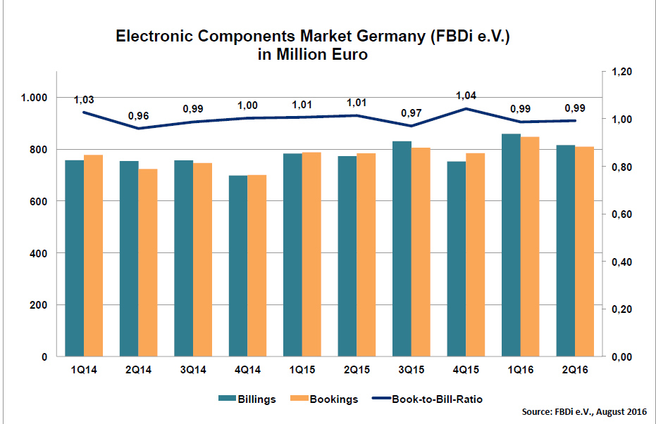German electronic component distribution market grows by 5.6% in second quarter 2016 (according to FBDi e.V.). Balanced book-to-bill rate.