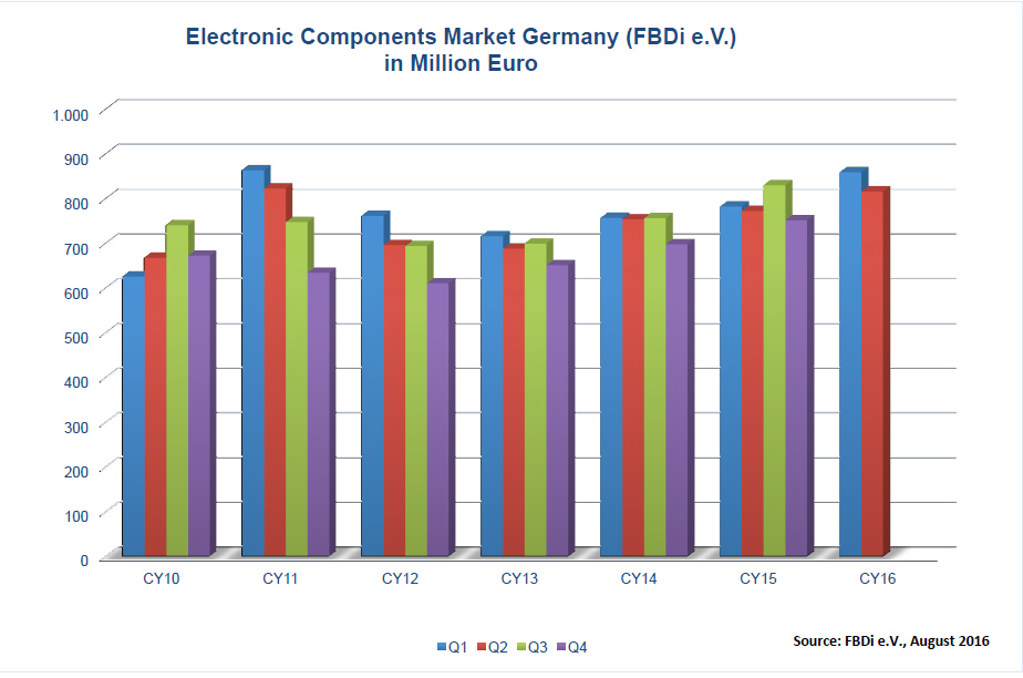 Bad Birnbach, August 31, 2016 – The member companies of the German electronic component distribution association FBDi e.V. report sales growth of 5.6% for the second quarter 2016; revenues totalled € 816 million. In summary, the first six months of the year recorded an increase in turn-over of 7.7%. Orders did not rise as strongly, increasing by 3.3% to € 809 Million in the second quarter 2016. The order increase across the first half of the year was still 5.4%.