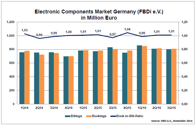 The German components distribution market has finished the third quarter of 2016 with a little decline. The revenues of the member companies dropped by 3.4% to 802 Mio. €. In contrast, orders rose by 0.5% (809 Mio. Euro). The resulting book-to-bill rate of 1.1 remains in the positive range.