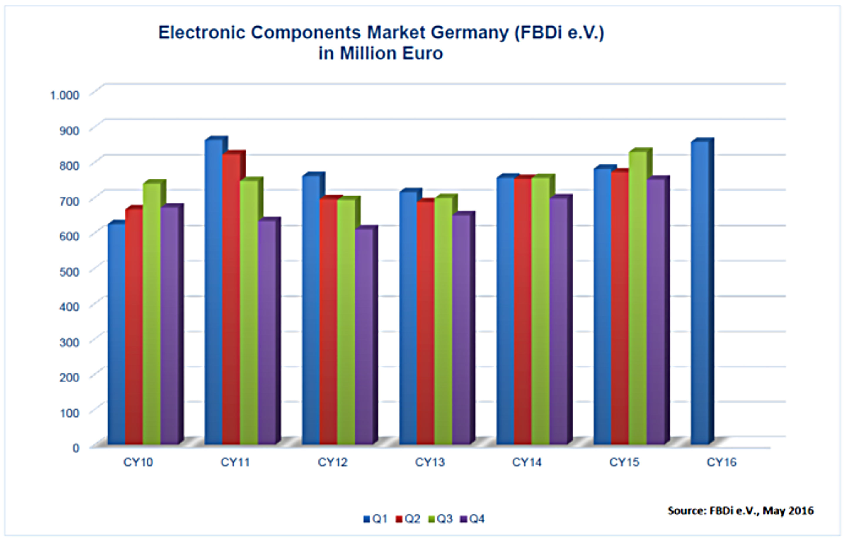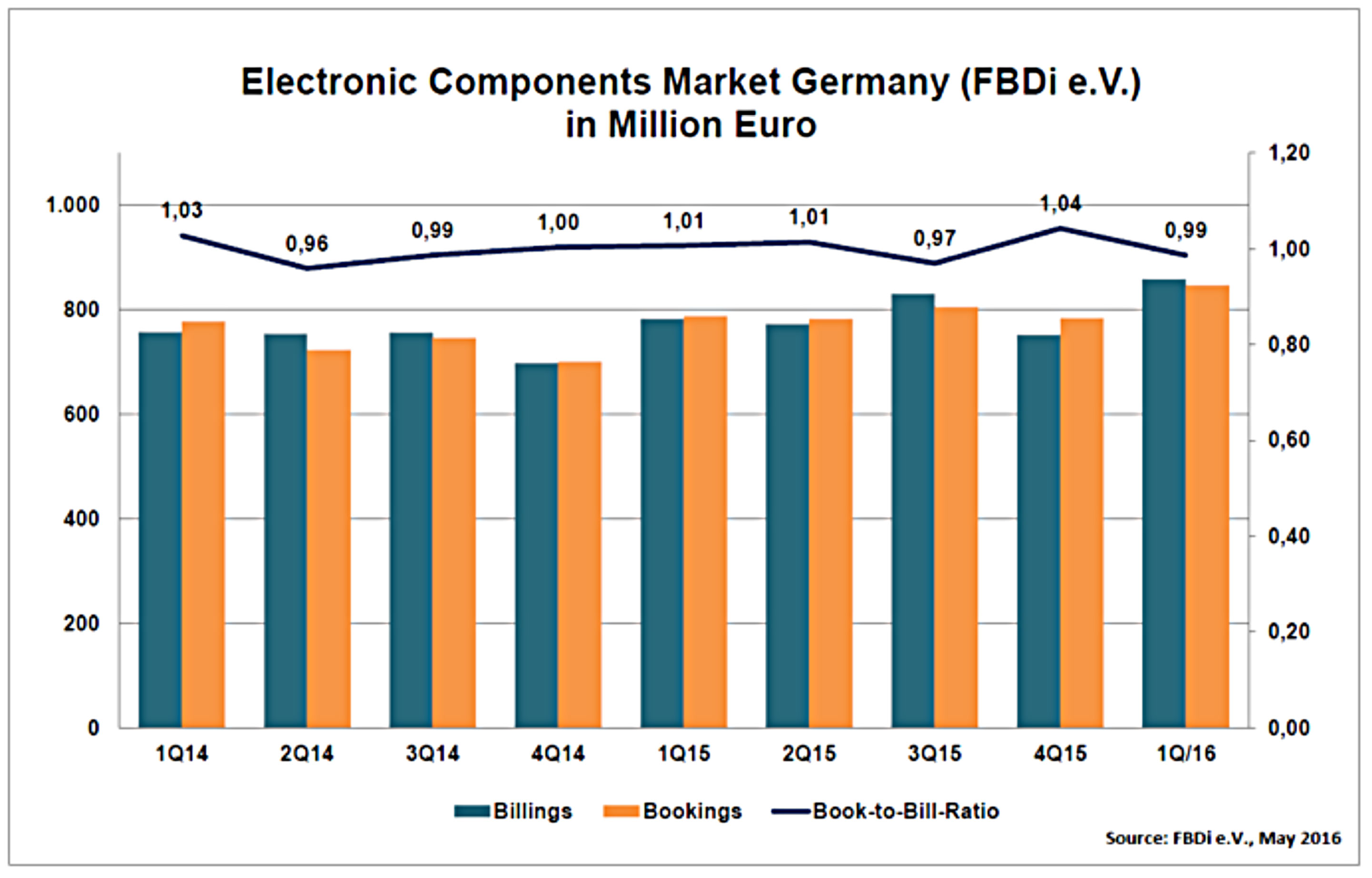 Der deutsche Bauelemente-Distributionsmarkt (gemäß FBDi e.V.) wächst im ersten Quartal 2016 um 9,7%. Ausgeglichene Book-to-Bill-Rate.