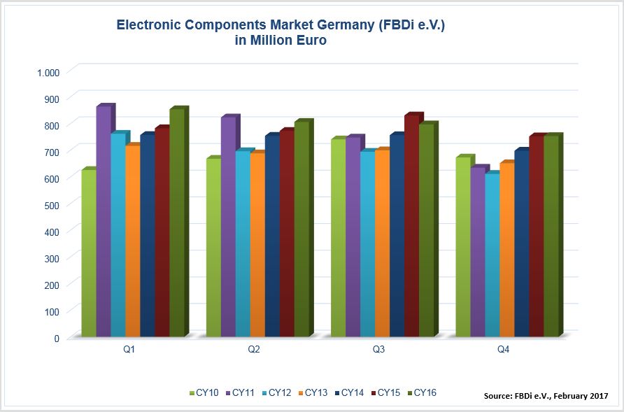 Deutlich besser als im Durchschnitt lief es bei den Halbleitern, die im vierten Quartal um 2,6% auf 532 Million Euro und im Gesamtjahr um 3,45% auf 2,26 Milliarden Euro zulegten. Die passiven Bauelemente gingen dagegen in Q4 um 5,3% auf 103 Millionen Euro zurück (2016: -0,2% auf 443 Millionen Euro), noch schlechter lief es bei der Elektromechanik, die um 4% auf 68 Millionen Euro zurückging (2016: -1,6% auf 299 Millionen). Starke Quartalsschwankungen gab es bei den kleineren Produktbereichen Displays und Sensoren, die im Jahresvergleich etwas Federn ließen. Dagegen wuchs der Umsatz mit Stromversorgungen im Jahresvergleich mit 2015 um 11,5% auf 85 Millionen Euro.